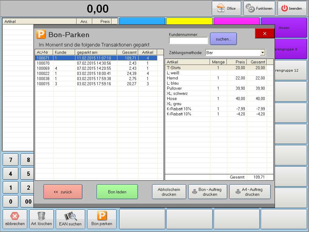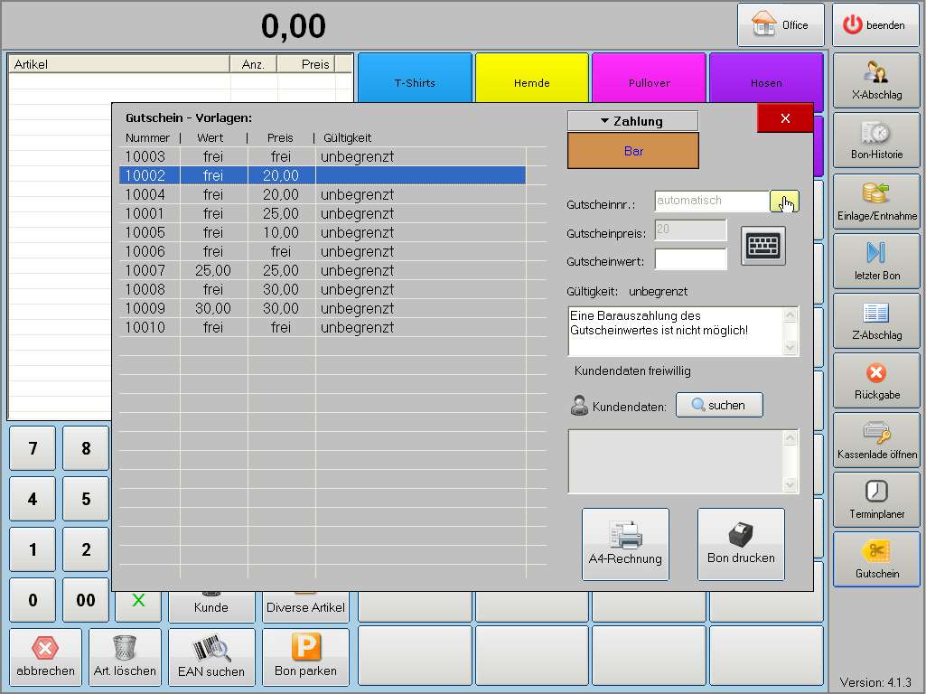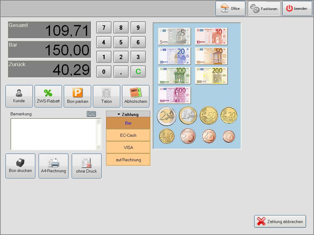 Bon parken, Gutscheine, A4-Rechnungen, Artikel-Optionen, Pfand & Leergut, Import / Export, Kundenverwaltung, Presse-Modul (VMP), Lieferscheine, Abholscheine, Aufträge, Inventur-Modul, Etikettendruck, Terminplaner etc.