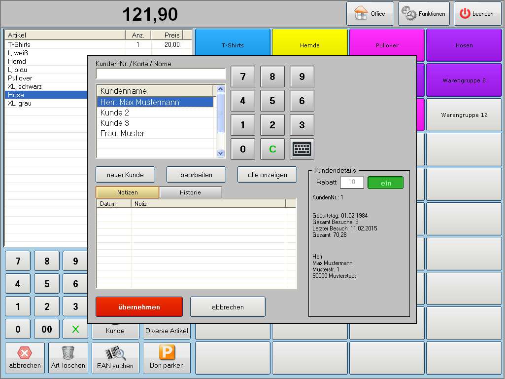 Auf dem Desktop stehen Ihnen 40 über den Touchscreen bedienbare Schnelltasten für Warengruppen (je 39 Artikel pro Gruppe) zur Verfügung - insgesamt können Sie also über den Touchscreen bis zu 1560 Artikel steuern. In der Datenbank können Sie praktisch eine unbegrenzte Anzahl von Artikel speichern - die ersten 1560 Artikel können Sie dabei über den Touchscreen steuern (wie oben beschrieben) und die Restlichen mit Barcodescanner aufrufen. Selbstverständlich, wenn Sie die Touchscreen-Funktion gar nicht dabei benutzen möchten, so können Sie nur den Barcodescanner dabei verwenden.
